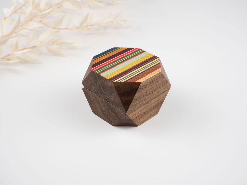 Our single boxes are perfect for storing a special ring. Some hold the ring in an upright position, others have a circular space for the ring to lie horizontally. Solid walnut, combined with natural and coloured hardwood veneers create a simple but stylish design aesthetic and high-level making skills ensure longevity of use too.